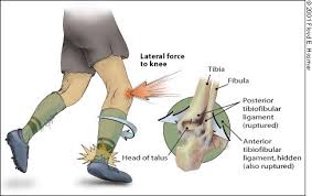 Entorses laterais do tornozelo: Quando a lesão ocorre em inversão, é provável que os ligamentos laterais estejam envolvidos. O ligamento talofibular anterior é o mais frequentemente danificado, mas também o ligamento calcaneofibular é frequentemente envolvido.