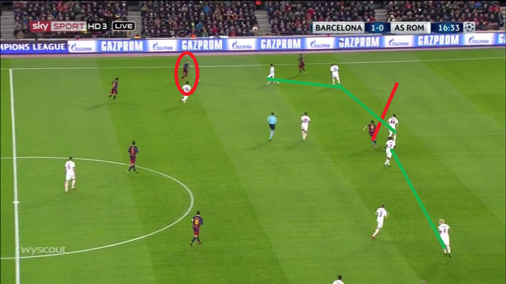 Estamos logo após o primeiro quarto e a equipe de Luis Enrique já está vencendo por 1 a 0. Nesta situação, o sistema catalão 4-3-3 eleva seu ponto focal, movendo para frente um meio-campista na linha dos três atacantes, forçando a Roma a defender com cinco jogadores para evitar ficar com quatro 1 contra 1.