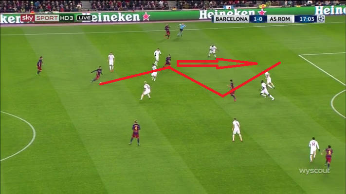 Claro, este é um plano de ação de Luis Enrique: mover a bola horizontalmente para esmagar as linhas defensivas do adversário. Neste caso, Neymar aponta para a linha defensiva da Roma que se esmagou até colocar 6 jogadores na mesma linha.