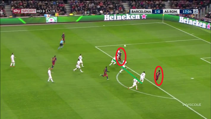 Neste frame, os três catalães não têm saída contra cinco jogadores da Roma, então a bola volta com um toque de calcanhar primeiro para Neymar, depois para Busquets.