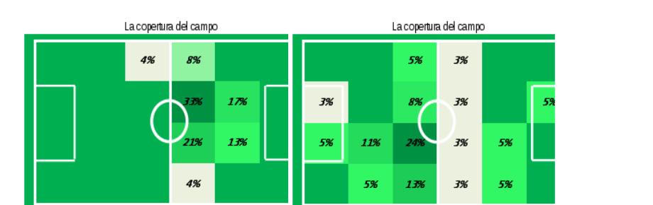 Este grande envolvimento na construção do jogo ofensivo permite que Pellè jogue muitas bolas, mostrando uma boa visão do jogo e uma inclinação natural para jogar de primeira. Com a seleção italiana, ele tentou 20 passes com uma porcentagem positiva de 70%, enquanto com o Southampton 16 passes bem-sucedidos foram apenas 50%. Sua característica mais impressionante é a tentativa frequente de jogar de primeira para acelerar a ação, ganhando tempo de jogo sobre o adversário: 39% dos passes foram realizados sem controlar a bola, 14 em 36, e 8 deles alcançaram o companheiro de equipe que aproveitou o bom passe de Pellè. Na figura abaixo, mostramos as áreas do campo ocupadas pelo atacante durante a partida contra o Chelsea. Podemos ver que tanto no primeiro quanto no segundo tempo da partida, Pellè apoia sua equipe em diferentes áreas, não se restringindo a tentar marcar um gol, mas também fazendo o “trabalho sujo”, menos chamativo, mas mais eficiente.