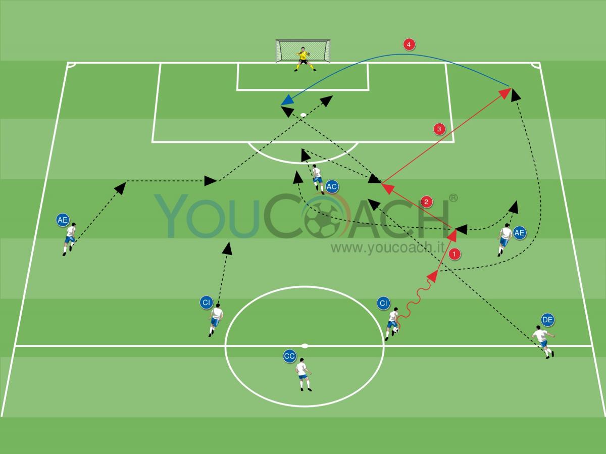 - O PE recebendo a bola, passa para o CA assistindo o MCI inserindo (4) (Fig. 6)