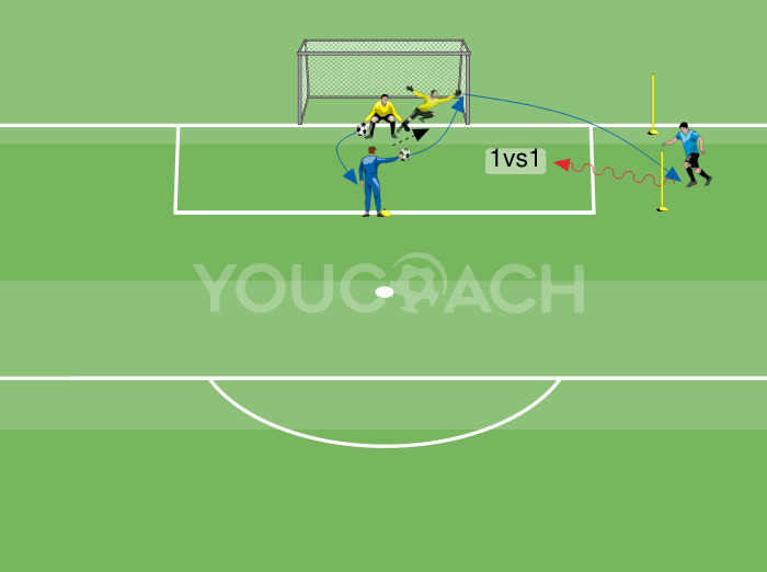 - Um jogador fica a 1 metro da mini baliza formada pelos postes. Quando o guarda-redes desvia a bola para a área correta, o jogador recupera a bola desviada e tenta marcar um golo sem restrições. O guarda-redes levanta-se rapidamente e vai realizar um 1v1 entre o jogador e o guarda-redes