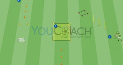Faça dois circuitos simétricos em zigue-zague com os marcadores dentro da área de grande penalidade (como mostrado na imagem). Deixe 2 metros entre os marcadores. Coloque uma baliza feita com 2...Técnica de Futebol
