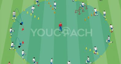 Em um círculo de cerca de 20 metros, prepare o material conforme mostrado na imagem. É importante alternar estações de mobilidade e técnicas. Os cones são colocados deixando 50 cm entre eles e os...Páginas