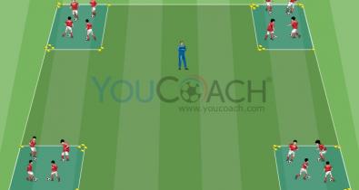 Crie um número suficiente de quadrados com cerca de 7x7 metros de tamanho para envolver todos os jogadores. Enumere cada canto dos quadrados usando os marcadores (de 1 a 4, como mostrado na figura).Técnica de Futebol
