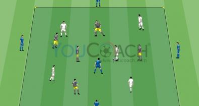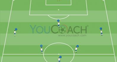 Coloque a equipe em metade do campo e simule a formação 4-3-3. O defensor (número 3 na imagem) começa com a bola.Tática de Futebol