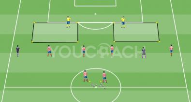 Delimite uma área de jogo medindo 25x20 metros. Coloque um gol no centro de cada lado menor. Forme duas equipes de sete jogadores.Tática de Futebol