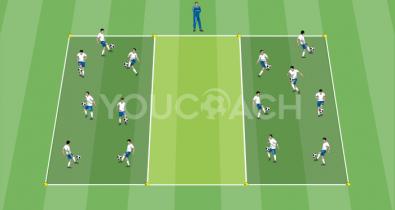 Crie com marcadores dois retângulos de jogo de tamanho igual de 20x15 metros, paralelos entre si e próximos um do outro. As duas áreas de jogo estarão separadas por cerca de 15 metros.Técnica de Futebol
