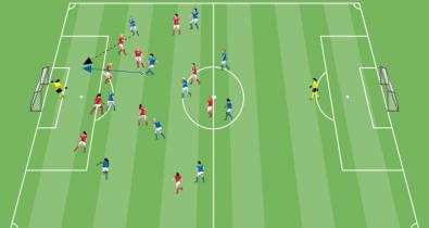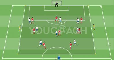 Crie com marcadores, a partir da linha de fundo, um espaço de jogo de cerca de 45x45 metros. Na parte externa de cada lado do quadrado, um jogador de apoio é colocado (jogadores amarelos na imagem).Tática de Futebol