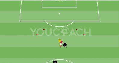 Logo fora da área de grande penalidade, crie duas zonas adjacentes de 30x10 metros (zona A e zona B na imagem).Técnica de Futebol