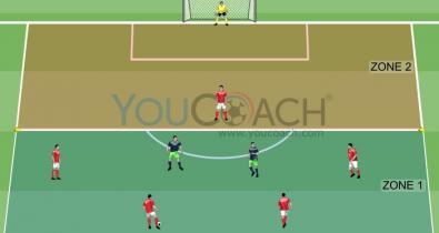 Coloque a baliza no lado comprido do campo. Divida o campo em 2 zonas de tamanho igual de (15x40) metros usando os marcadores. Na zona 1, a mais distante da baliza, coloque 2 jogadores azuis contra 4...Tática de Futebol