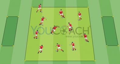 Crie um quadrado com base no número de jogadores disponíveis. Crie duas áreas menores perto de dois lados opostos do quadrado, fora do perímetro. Cada jogador com a bola fica na área central.Tática de Futebol