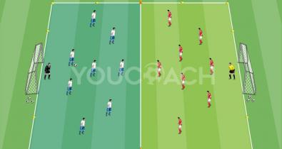 Forme um campo de 40x30 metros com balizas e guarda-redes nas extremidades mais curtas. Divida os jogadores em 2 equipas (coletes brancos e vermelhos na imagem). Coloque 2 cones no meio dos lados...Tática de Futebol