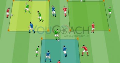 Na área do campo definida para o exercício, forme três quadrados com lados de 4 metros. Posicione os jogadores para formar 4v2s em dois quadrados e, em um quadrado, coloque 4 jogadores com uma bola....Tática de Futebol