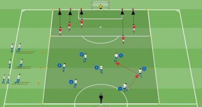 Forme uma área de jogo de 55x35 metros usando alguns marcadores. Coloque dois golos no lado mais curto do retângulo. No meio da área de jogo, crie uma área de 25x35 metros marcando-a com 4 cones (...Páginas