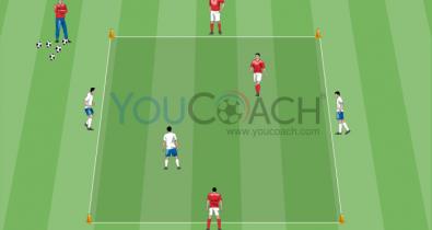 Crie um quadrado de 11x11 jardas usando marcadores. No meio de dois lados opostos, coloque dois mini-golos. Coloque dois jogadores em cada canto da área, cada um com uma bola. Dentro do quadrado,...Técnica de Futebol
