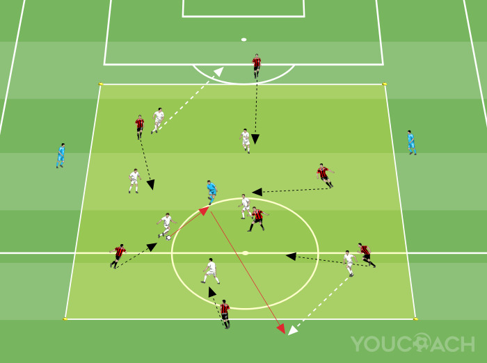 - Se a bola for recuperada pelos oponentes da equipe branca, os jogadores vermelhos do lado de fora se aproximam do jogador branco em posse, trabalhando na transição e tentando recuperar imediatamente a bola implementando o Gegenpressing. Pelo contrário, os jogadores da equipe branca devem manter a posse, criando novas linhas de passe geradas pelo ataque ao espaço na lateral libertada pelo jogador vermelho, onde um jogador branco atuará assim que sua equipe mantiver a posse