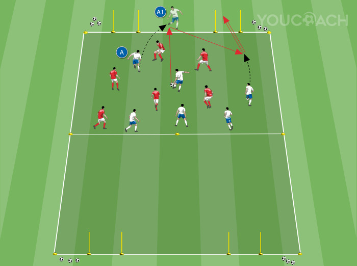 Use marcadores para delimitar um pequeno campo de jogo de 40x30 metros. Novamente usando marcadores, divida o campo em duas metades iguais. Coloque dois golos (formados por dois pares de postes) com aproximadamente 1,5 metros de largura em ambas as linhas de fundo, com cerca de 10 metros de distância. Duas equipas de seis ou sete jogadores tomam as suas posições no campo (jogadores brancos contra jogadores vermelhos na imagem). Coloque bolas atrás dos golos para reiniciar o jogo rapidamente.