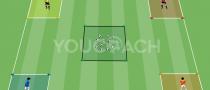 - Jogadores vestindo camisas de cores diferentes (vermelho, amarelo, azul) começam uma combinação de passes no triângulo, rotacionando posições entre si (1, 2, 3 e 4 na figura), enquanto os jogadores atrás do gol driblam individualmente (cada um com uma bola)