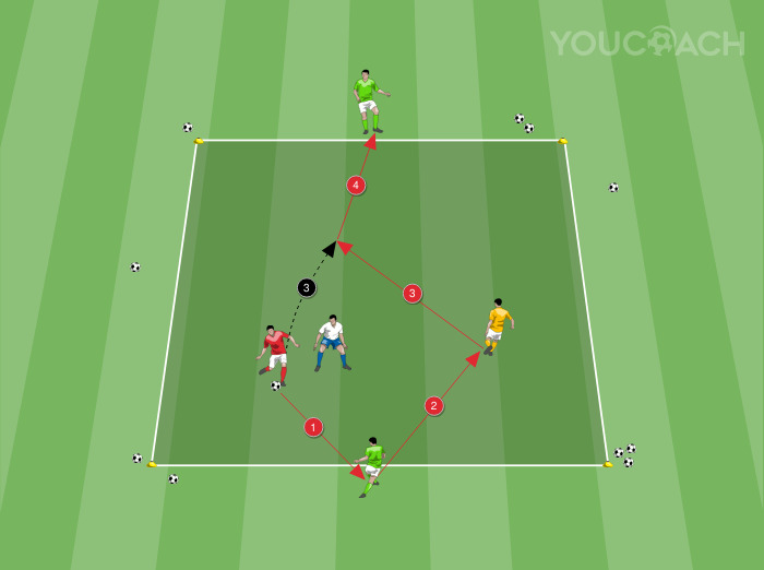 - Ao rodar os jogadores, evite deixar que os jogadores dentro do quadrado joguem mais de duas posses consecutivas