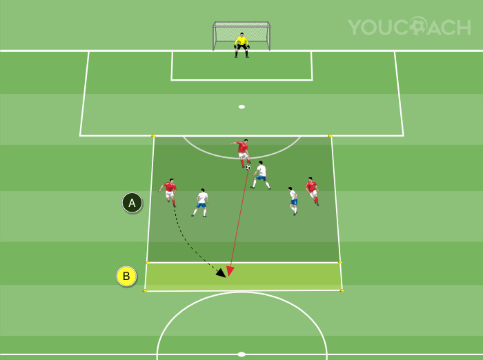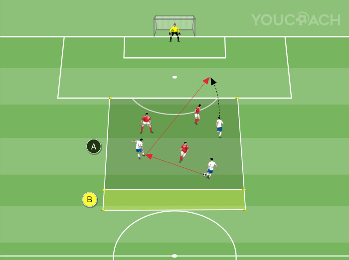 O exercício ocorre em metade do campo. Começando na linha da grande área, a 16 metros do gol, crie um quadrado de 25x25 metros usando marcadores (como mostrado na imagem). Divida o quadrado em duas zonas: a zona mais próxima do gol, medindo 25x23 metros (Zona “A”), e a zona oposta ao gol, medindo 25x2 metros (Zona “B”). Os jogadores são divididos em duas equipes de três (na imagem, três atacantes brancos e três defensores vermelhos) e se posicionam dentro da GRANDE ÁREA. Um goleiro defende o gol. A bola é dada aos atacantes para iniciar o jogo.