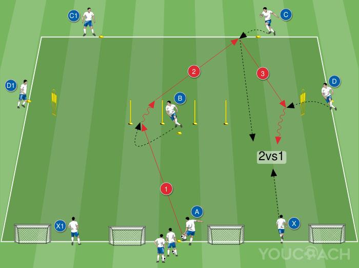 - Ao sinal do treinador, o jogador A passa a bola para B, que entretanto faz um movimento de desmarcação com um contramovimento para um dos dois golos laterais.