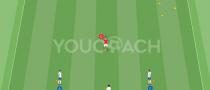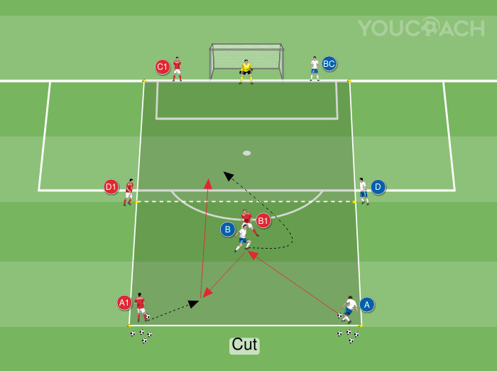 - O atacante deve tentar marcar um gol por meio de ação individual (por exemplo, fintas e dribles) ou cooperando com os jogadores nas laterais do campo (por exemplo, por meio de tabelinhas, passes e movimentações, cortes, bolas enfiadas, fintas, etc.)