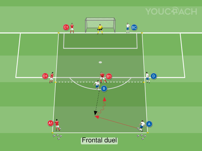 Dependendo do número de jogadores, configure um ou dois campos com marcadores. Forme duas equipes e defina os pares que se enfrentarão em um duelo. Organize os jogadores como na imagem: A e A1, com a bola, nos cantos do lado curto em frente ao gol, dentro do campo B (defensor) e B1 (atacante), D e D1 um à direita e o outro à esquerda, aproximadamente no meio do lado comprido, C e C1 próximos ao gol. Assim que a ação terminar, os jogadores A e A1 ocupam o lugar de B e B1, B e B1 ocupam o lugar de C e C1, C e C1 movem-se para D e D1 e, finalmente, D e D1 vão para A e A1. Um goleiro é posicionado para defender o gol. Assim que a ação terminar, incentive os jogadores a se moverem rapidamente de uma posição para outra. Na próxima rodada, quem atacou defende. Coloque um suprimento de bolas nas posições iniciais para dar continuidade e ritmo ao exercício.