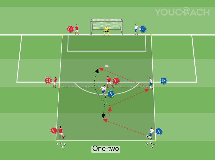 - O exercício começa com um passe de A ou A1 para B, que se aproximou