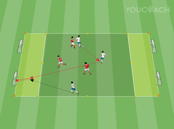 - Um jogo de posse de bola de 3 contra 3 é jogado dentro da zona central (zona de 20x10 metros)
