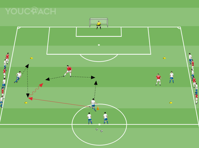 - Ao sinal de início do treinador, um atacante dentro do corredor lateral começa uma série de contramovimentos para evitar a marcação do oponente direto. O atacante pode decidir atacar a profundidade, perdendo o marcador em direção ao gol, ou ir em direção ao companheiro de equipe na posse da bola