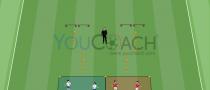 Divida o espaço desde a linha da grande área até ao meio-campo em seis zonas, com as duas centrais mais largas. Divida os jogadores em duas equipas de oito. Em cada retângulo lateral coloque um jogador por equipa, enquanto nos dois centrais coloque um par por equipa. Coloque três mini-balizas como na imagem. O guarda-redes defende a baliza.