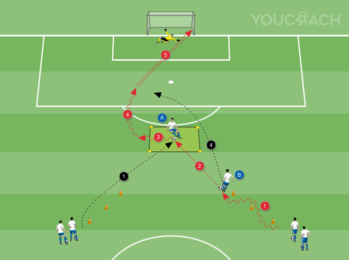 - O jogador B conduz a bola através de três cones em slalom; ao mesmo tempo, o jogador A corre a toda a velocidade para o interior do retângulo