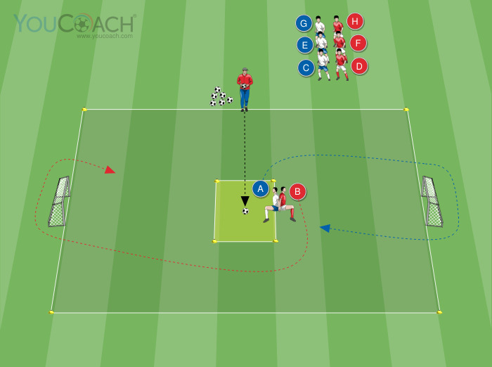 Crie um retângulo medindo 20×10 metros. No centro de ambos os lados menores, coloque um mini-gol. No centro do retângulo, crie um quadrado de 3×3 metros. Forme pares com jogadores de altura semelhante (pelo menos para as primeiras séries). Os jogadores de um par (A e B na imagem) ficam no centro do quadrado, de costas um para o outro. O treinador, com um bom suprimento de bolas, fica do lado de fora de um lado maior do retângulo, de frente para o quadrado central.