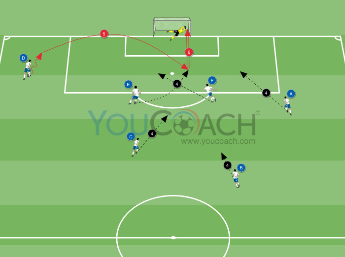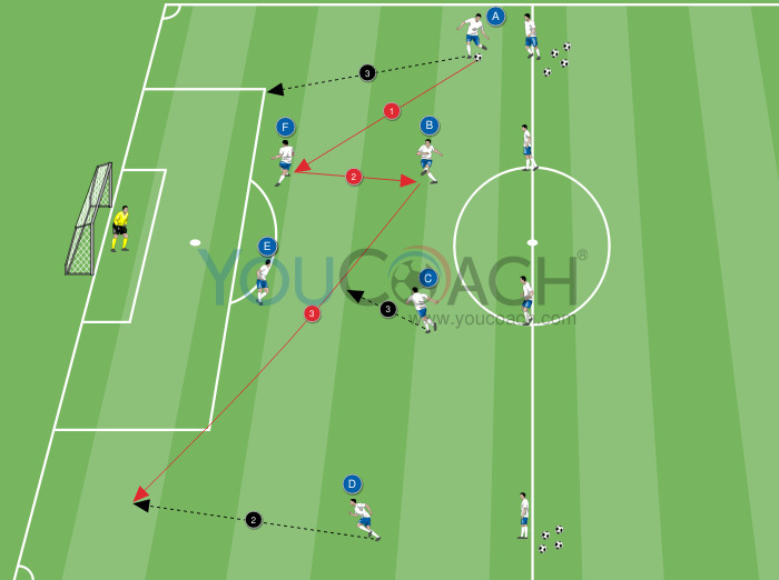 - D controla a bola e conduz pela faixa lateral; os avançados E e F atacam a área e o ala A aproxima-se da área de penálti