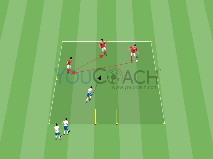 - O treinador pode limitar o número de toques na bola dos atacantes a três na situação inicial de 3 vs 1