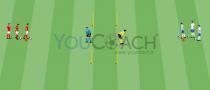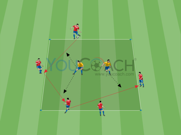 Os jogadores ocupam todo o quadrado. Coloque um jogador atacante em três lados do mesmo, enquanto no último lado há dois jogadores. Os jogadores dentro do quadrado tentam recuperar a bola. Cada jogador atacante só pode mover-se no seu lado do quadrado. Se um jogador amarelo interceta um passe, troca de posição com o jogador atacante.