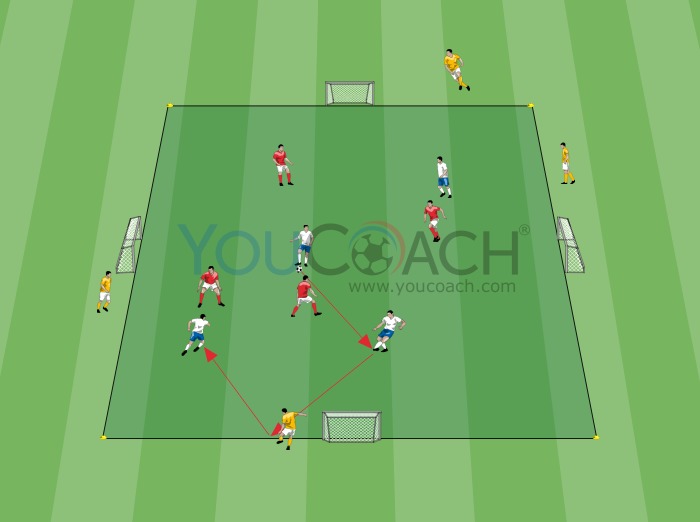 Este é um jogo reduzido com muitas chances de marcar, mas o objetivo principal é manter a posse de bola. Os jogadores têm de trabalhar arduamente para libertar o espaço e, depois de atingir um número fixo de passes consecutivos, podem começar a criar jogadas para marcar.