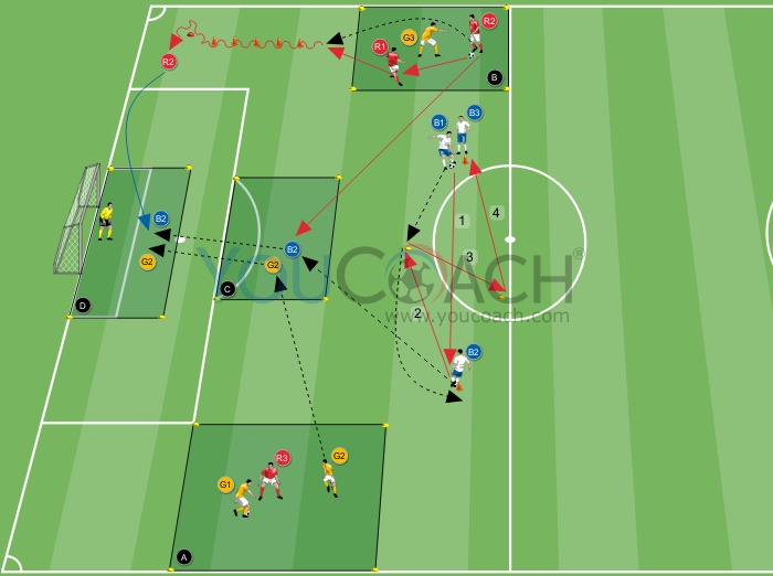 - um 2 vs 1 na zona B (R1 e R2 contra G3), enquanto os jogadores brancos B1 e B3 continuarão a jogar uma "tabelinha" até à posição 3 do circuito: o jogador que recebe o terceiro passe terá de driblar em direção ao cone e começar o exercício novamente.