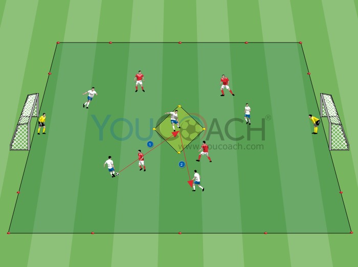 - O exercício começa quando o treinador lança a bola dentro da área de jogo; consiste em um jogo de 4 vs 4 com um jogador neutro na "base".
