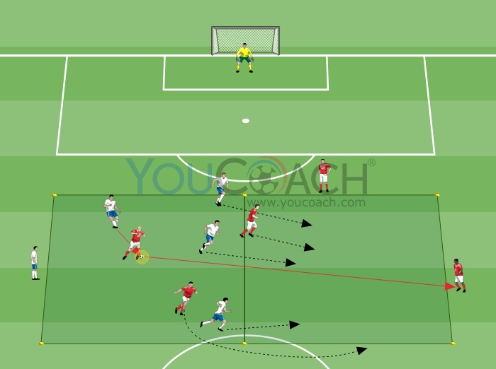 - Incentivar o passe e movimento: Depois de passar a bola a um colega de equipa, o jogador continua a sua corrida para ir para um espaço vazio e receber a bola novamente