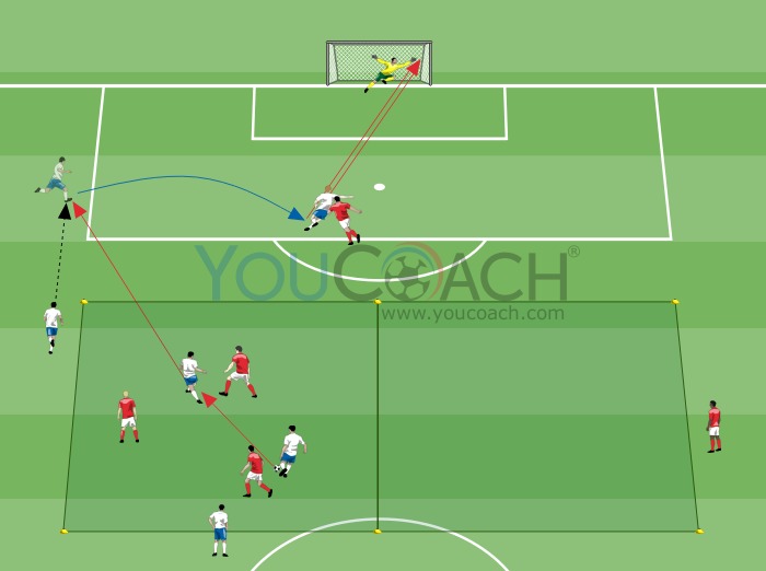 - Se os vermelhos recuperarem a bola, passam-na para os colegas de equipa no outro quadrado e vão para lá seguidos por 3 defesas brancos (Figura 1)