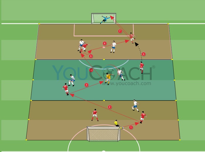 - Se os jogadores conseguirem passar a bola para o avançado, um médio pode entrar na outra zona jogando um 2 vs 2 tentando marcar