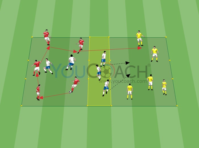- Se a equipa que possui a bola executar 5 passes, pode passar a bola para a equipa no outro campo (ver imagem) e dois jogadores que estão no campo central entram na outra área para tentar recuperar a bola