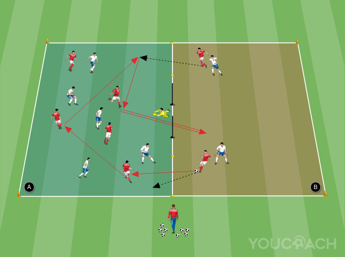 - A equipe branca, neste caso, tem que defender o gol e, em seguida, após conquistar a bola, mover rapidamente todos os seus jogadores para o campo B, para começar a atacar o gol dos adversários. Nesta fase, a equipe vermelha deve defender o gol movendo seus jogadores para o campo B, que é o seu próprio meio campo defensivo