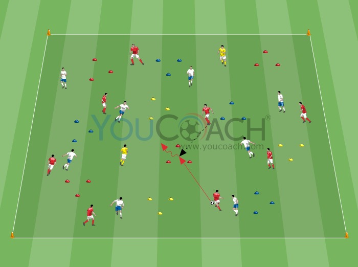 Crie, com cones, uma área de jogo com 45 jardas de largura e 35 jardas de profundidade. Dentro desta área, organize uma série de triângulos equiláteros (cada lado mede 2 jardas), criados com marcadores de uma cor diferente. Cada triângulo deve ser formado por marcadores da mesma cor. Divida os 18 jogadores da seguinte forma: duas equipas, cada uma com 8 jogadores (equipa vermelha e equipa branca na ilustração) + 2 jogadores neutros (jogadores amarelos).