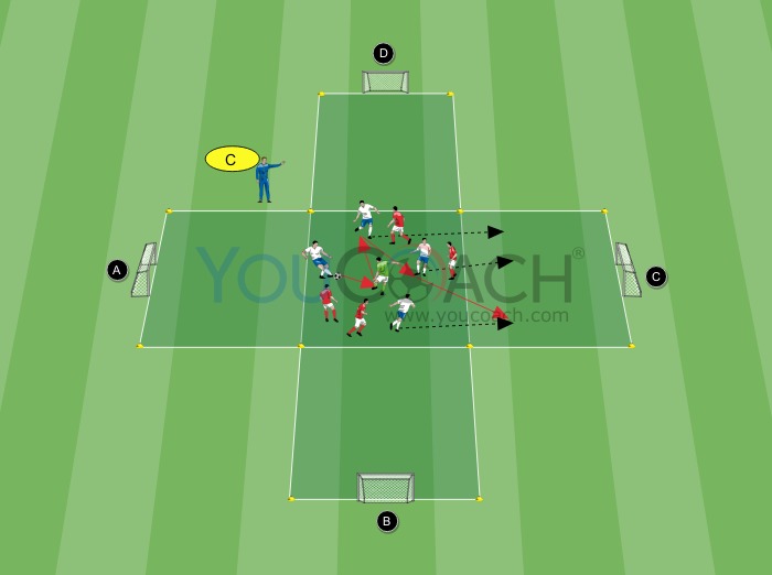 - Depois que os jogadores completarem um número mínimo de passes sem intercepção dos adversários, o treinador anuncia a letra do gol para onde ir para marcar (letra "C" na imagem)