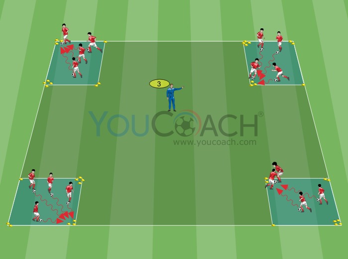 - Quando o treinador chama um número de 1 a 4, todos os jogadores têm que transportar a bola rapidamente em direção ao canto correspondente (o treinador chama o número 3 na figura)