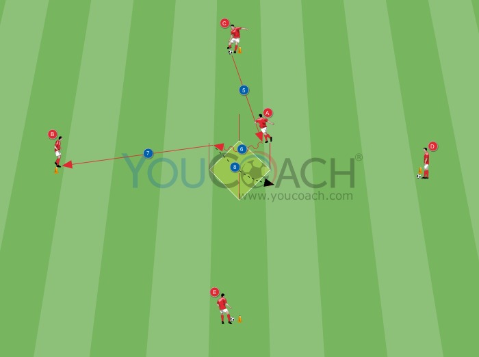 Coloque 4 cones para formar um quadrado de 20x20 metros. Coloque um quadrado de 5x5 metros usando as estacas no centro do quadrado de 20x20 metros, definindo o vértice em linha com o quadrado maior. Coloque um jogador B, C, D e E em cada cone. Coloque o jogador A no centro do quadrado. Dê uma bola aos jogadores B, C e D.
